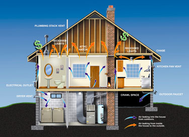 - Air Sealing: It’s important to identify and seal areas where air is coming in and exiting the home. As you can see from the diagram below, attention to these areas is crucial.